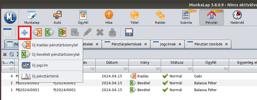 A menüben található  ikonra kattinta új kiadási / bevételi pénztárbizonylatot, új jogcímet illeteve új pénztártömböt hozhatunk létre