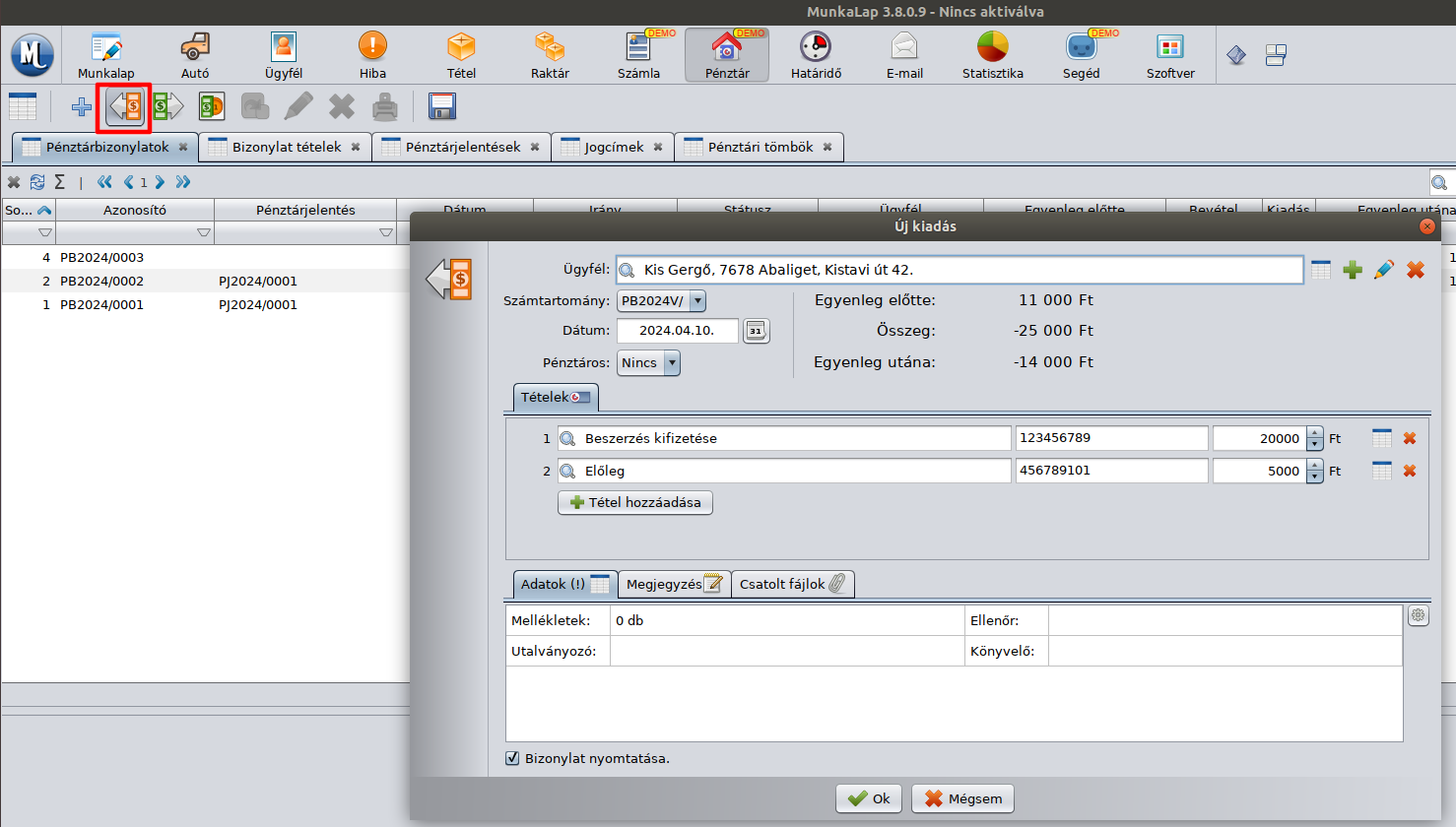 Az új kiadási és bevételi pénztárbizonylat létrehozása hasonlóan végezhető. A folyamatot a kiadási bizonylat példáján mutatjuk be.