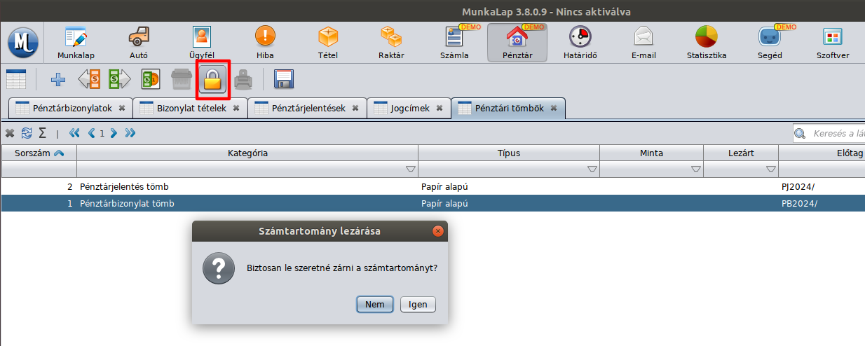 A tömb lezárásához lépjen be a pénztári tömbök táblázatába. A lezárni kívánt péntárbizonylat tömb vagy pénztárjelentés tömb kijelölése után válassza a menüsorban megjelenő "Lakat" ikont. A lezárt állapotjelzés megjelenik pénztárbizonylat tömb sorának "Lezárt" oszlopában.