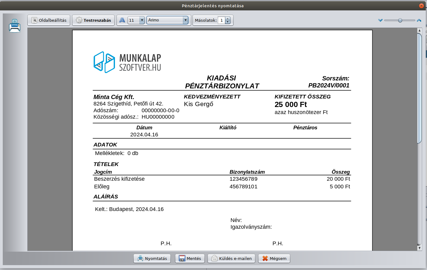 A pénztárbizonylatot a menüsorból is nyomtathatjuk a nyomtatni kívánt bizonylat sorának kijelölése után anyomtató ikonra kattintva. Példa a pénztárbizonylat nyomtatására: