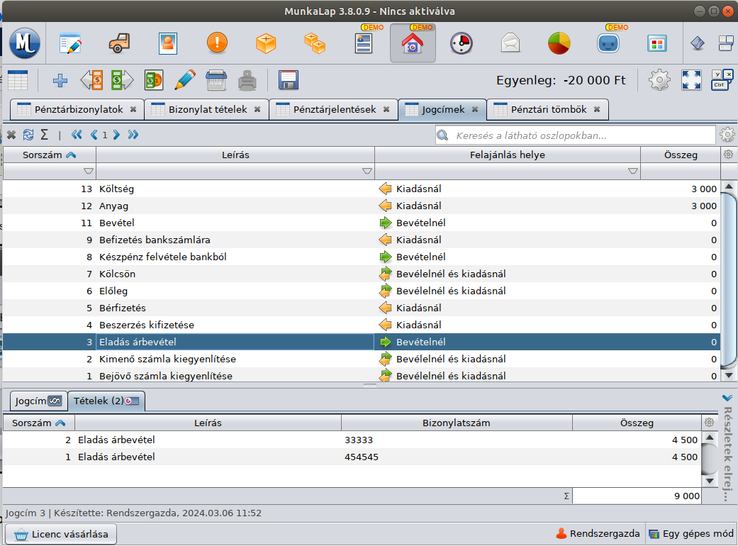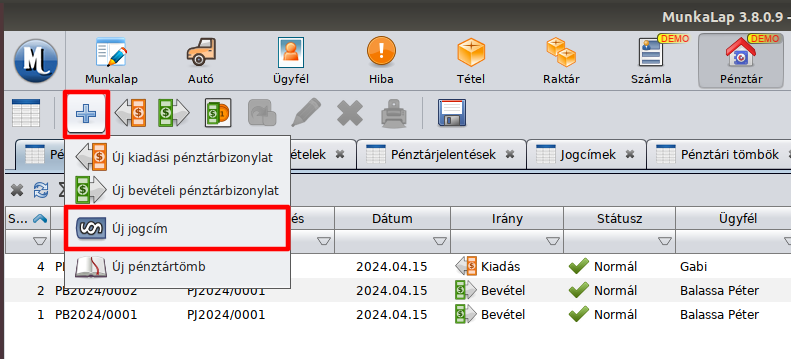 Új tétel jogcímet létrehozni a menüből lehet. A pénztárbizonylat létrehozásánál (3.4.) a létrehozott jogcímeket egy listából lehet kiválasztani és tételesen hozzáadni a bizonylathoz.