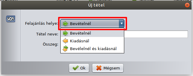 A tétel paraméterezésénél választhat, hogy bevételi és/vagy kiadási bizonylatnál szeretné használni az adott tételt.