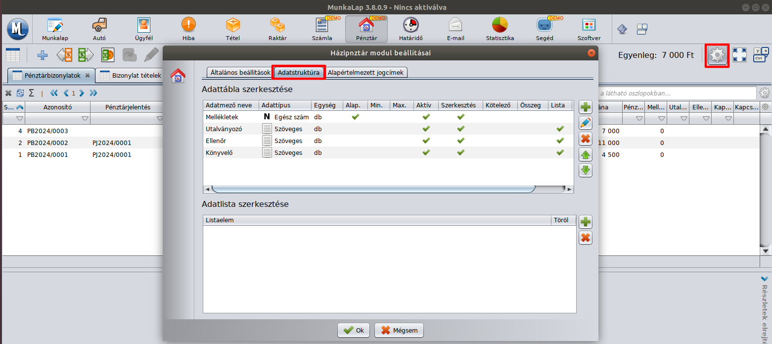 Ezen a beállítási fülön a pénztárbizonylati rekordhoz kapcsolt adatmezőket lehet létrehozni, szerkeszteni, törölni és átrendezni. Bővebb leírást az adattáblák kezeléséről itt talál: Adattáblák kezelése.