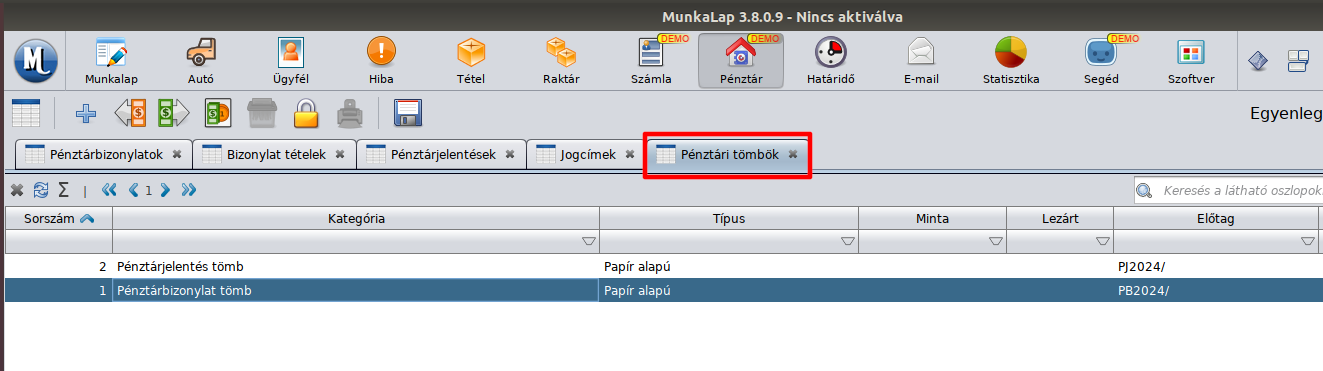 • Pénztári tömbök: A pénztárjelentések és pénztártömbök listája, itt lehet lezárni az egyes tömböket