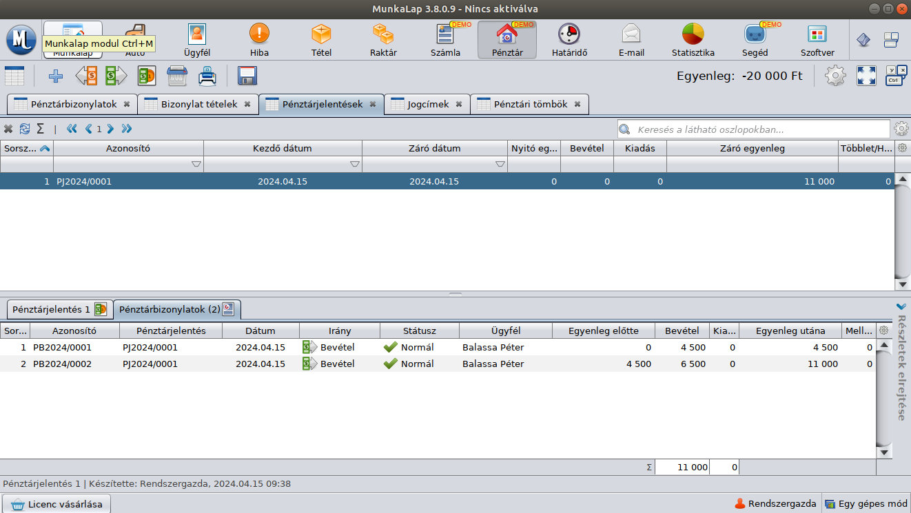 Az elkészített jelentéseket a Pénztárjelentések táblázatban tekintheti meg. Itt a jelentés részletei és a kapcsolódó pénztárbizonylatok adatai is fel vannak tüntetve.