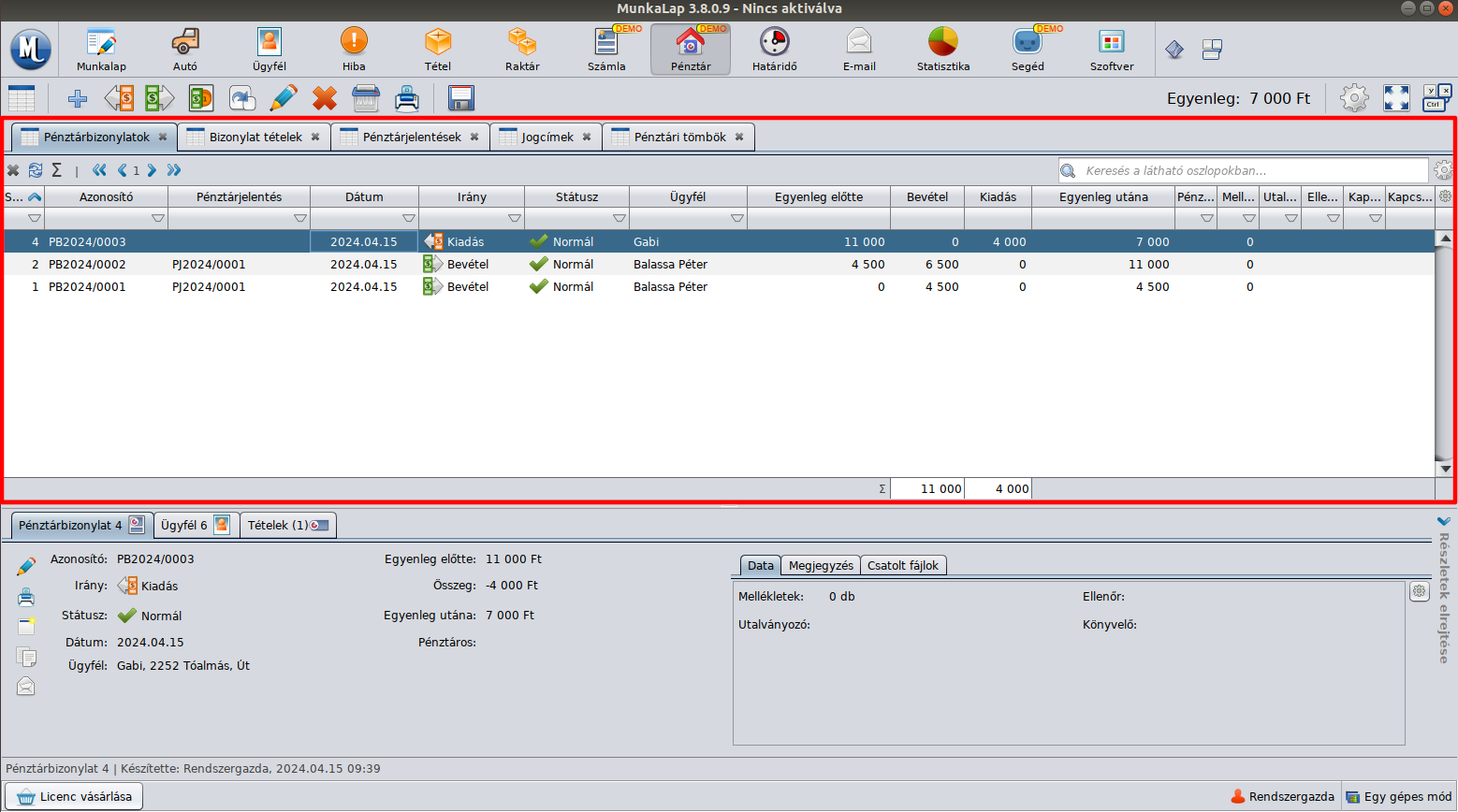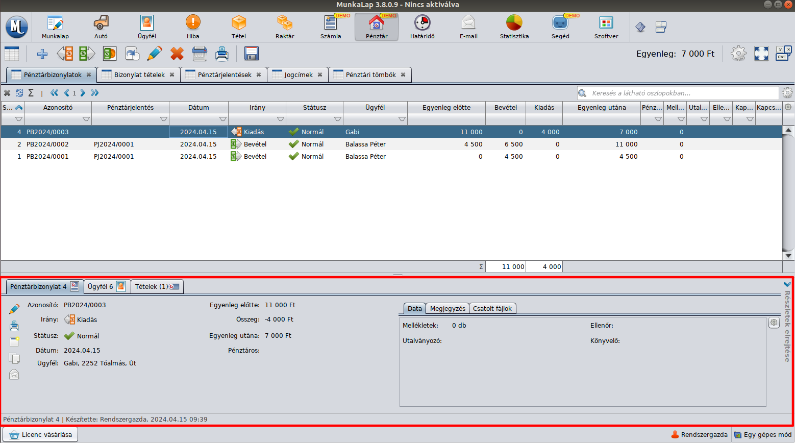 A modul alsó részén jelennek meg a kiválasztott rekord részletes adatai. Megjelennek a rekordhoz kapcsolódó pénztárbizonylat, ügyfél, pénztárjelentés, tétel, stb. adatok.